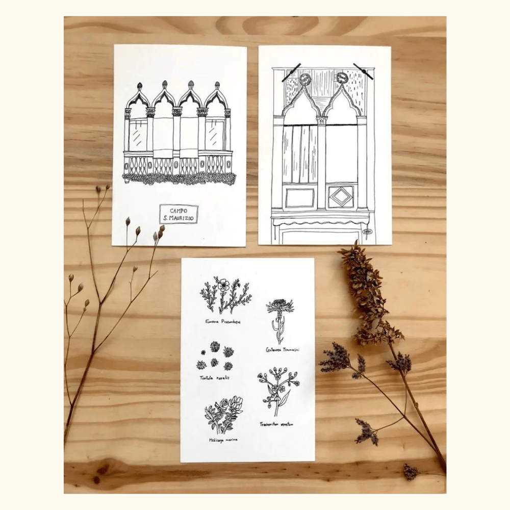 Postcard prints of ink pen drawings picturing venetian windows, and the lagoon's flora: five unique native species of the Alberoni Dune Oasis ecosystem.